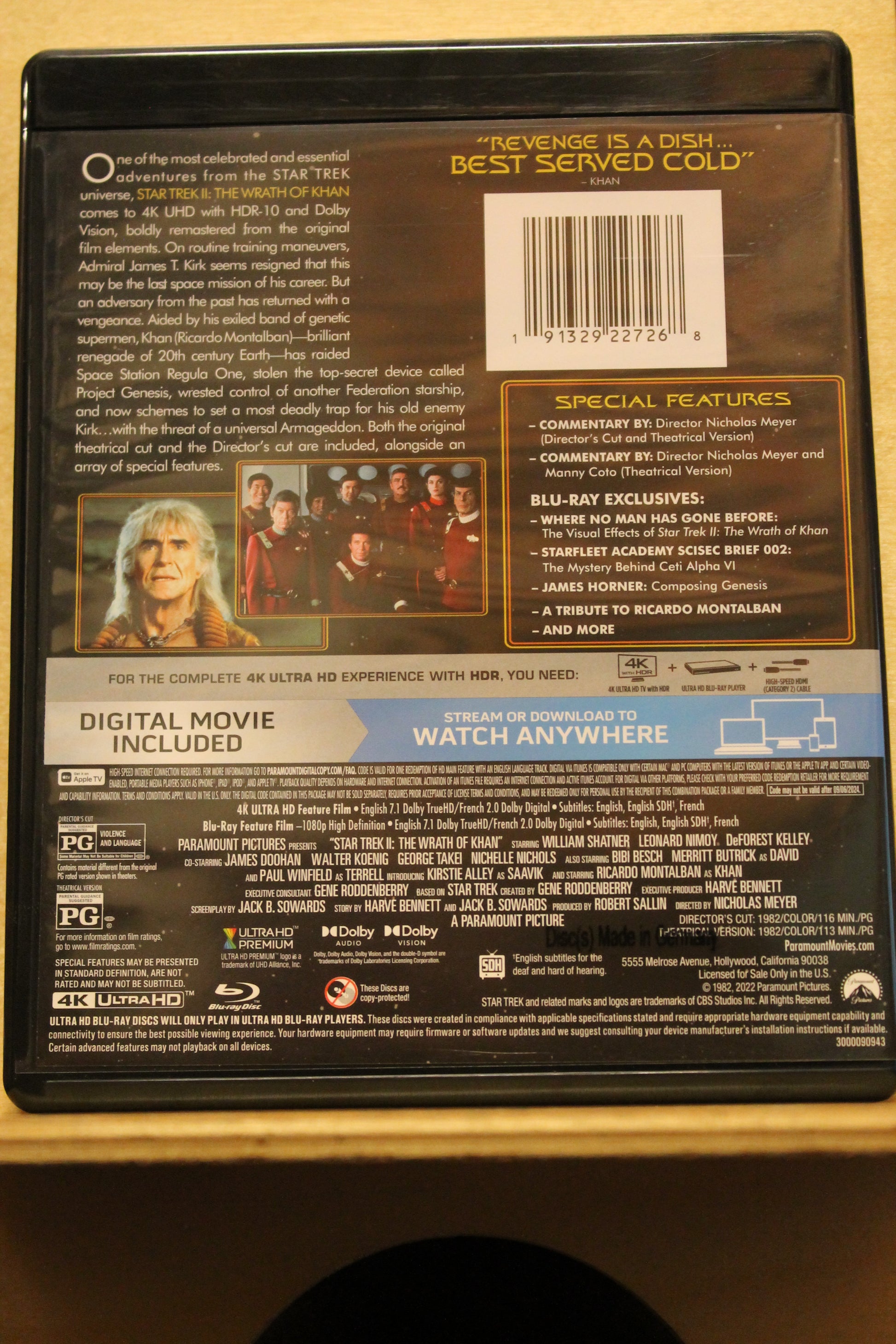 One of the most celebrated and essential adventures from the STAR TREK universe, STAR TREK II: THE WRATH OF KHAN comes to 4K UHD with HDR-10 and Dolby Vision, boldly remastered from the original film elements. On routine training maneuvers, Admiral James T. Kirk seems resigned that this may be the last space mission of his career. But an adversary from the past has returned with a vengeance. Aided by his exiled band of genetic supermen, Khan (Ricardo Montalban)—brilliant renegade of 20th century Earth—has raided Space Station Regula One, stolen the top-secret device called Project Genesis, wrested control of another Federation starship, and now schemes to set a most deadly trap for his old enemy Kirk… with the threat of a universal Armageddon. Both the original theatrical cut and the Director’s cut are included, alongside an array of special features.